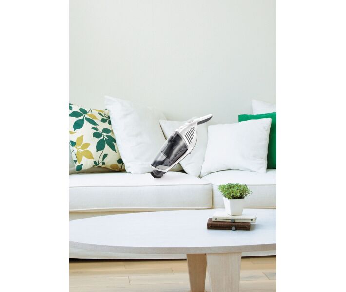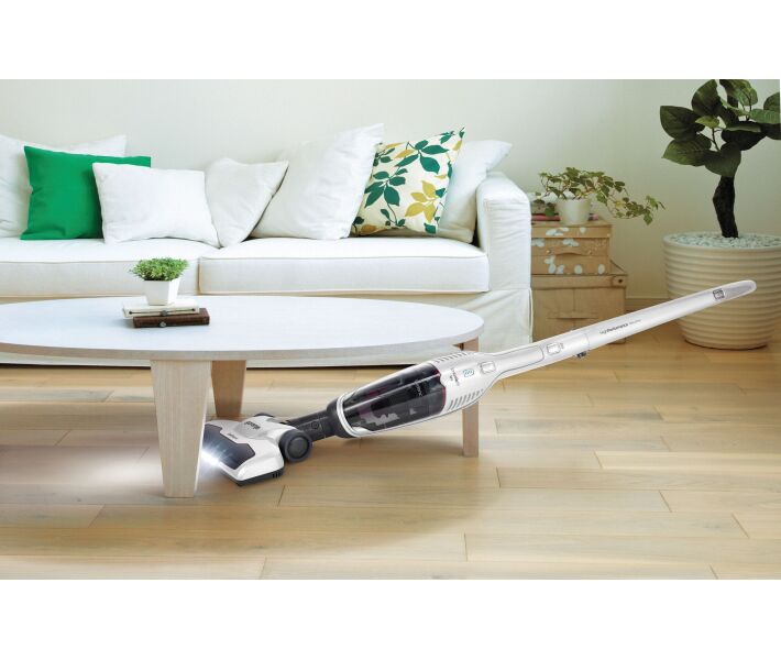 Пилосос має вертикальну конструкцію, яка передбачає використання пристрою в повнорозмірному варіанті і в компактному. Другий кращий для приміщень з обмеженою площею, в яких повноцінному вертикальному пилососу немає місця.