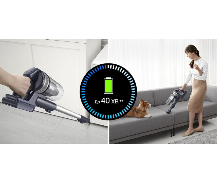 Насолоджуйтесь тривалим прибиранням без підзарядки. Акумулятор великої ємності забезпечує всмоктування до 40 хвилин*. І ви можете замінити його запасним акумулятором** та прибирати до 80 хвилин. Він зберігає 70% своїх первісних характеристик до 500 циклів ***.