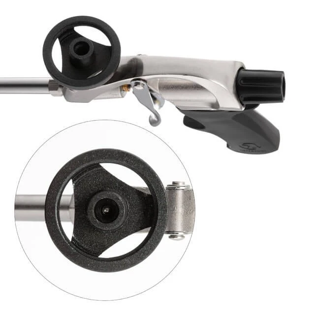 На пістолеті є регулювання подавання піни, що вкрай важливо для заощадження матеріалу та точності монтажних робіт. Сопло виготовлене зі сплаву кольорових металів, що дає змогу навіть після тривалого використання забезпечити високу герметичність голки. До комплекту входять чотири пластикові насадки-наконечники.