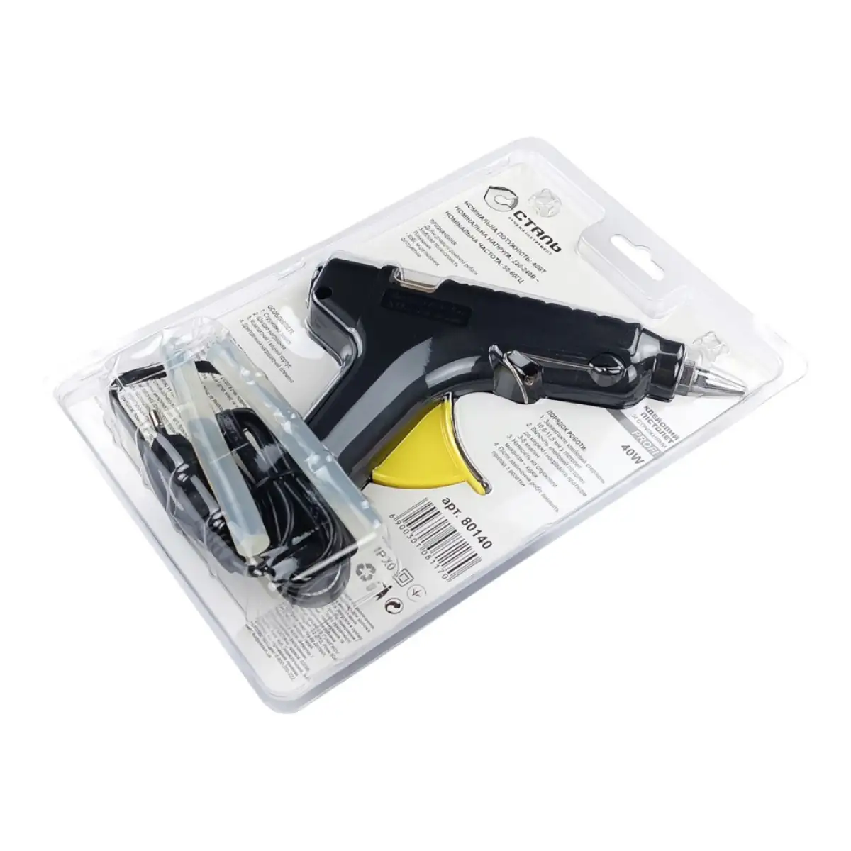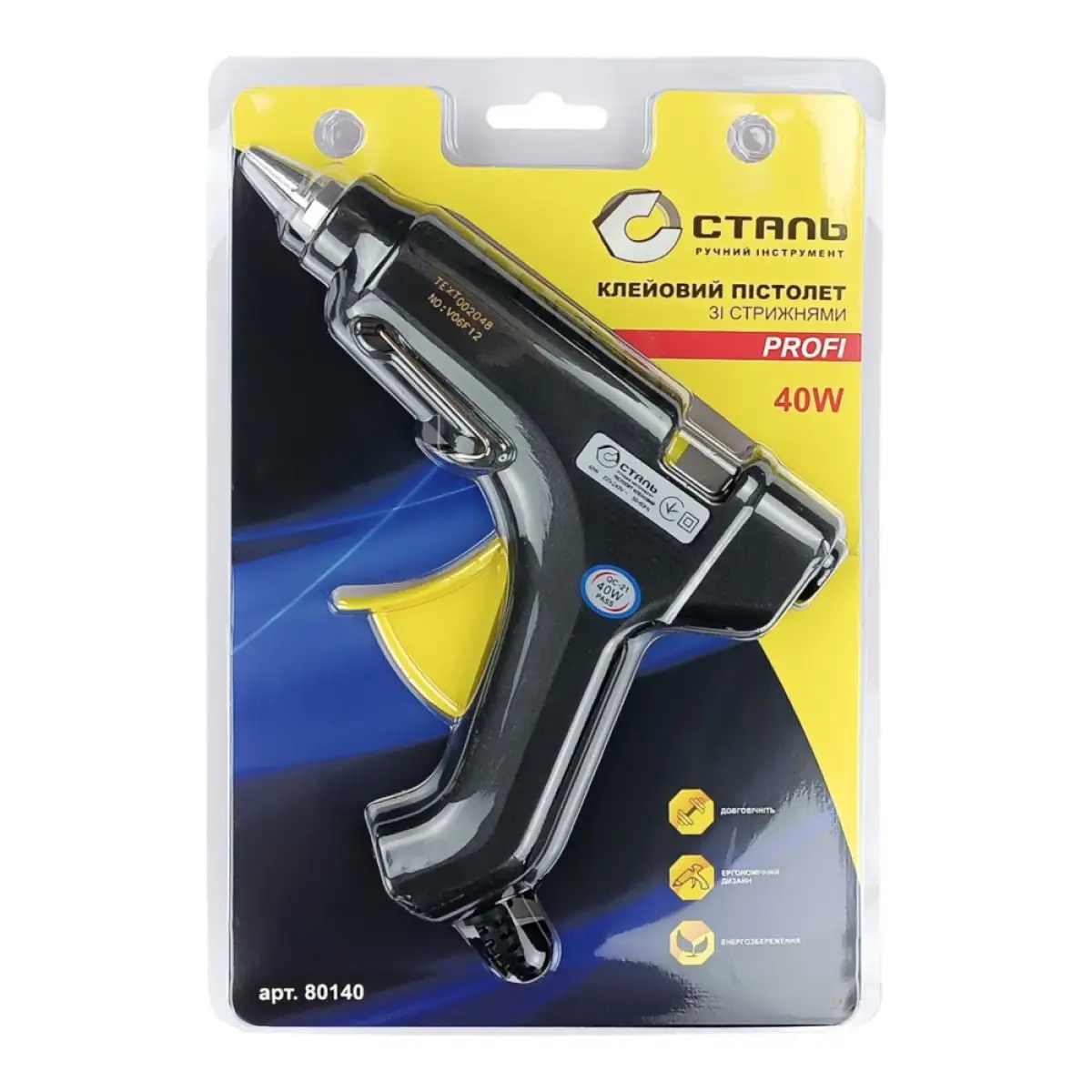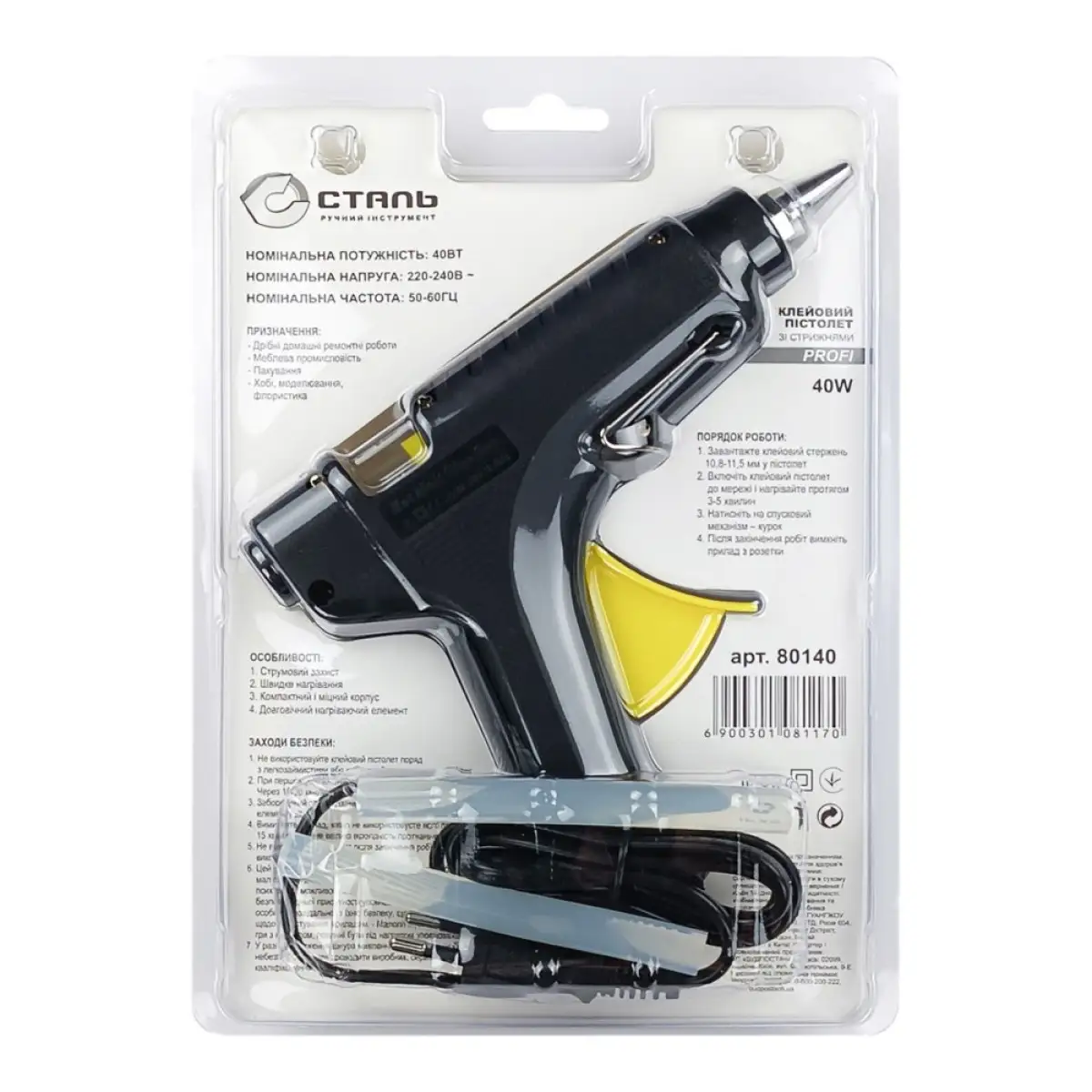 Клейовий пістолет зі стрижнями Сталь 40W призначений для склеювання кераміки, пластику, паперу, картону, дерева та металу. Використовується з клейовими стрижнями діаметром 8 мм. Корпус виконаний з термостійкої пластмаси. Процес нагрівання до робочої температури (до 200°C) ніяк не впливає на міцний пластик корпусу, тому безпечно користуватись інструментом можна впродовж довгого періоду.