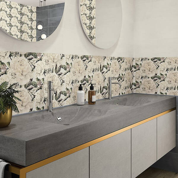 Настінна плитка з ніжним квітковим орнаментом і сатиновим покриттям надає інтер’єру легкості та витонченості. Світлий фон візуально розширює простір, а декоративний візерунок додає вишуканий акцент. Ідеально підходить для оздоблення ванних кімнат, поєднуючись з однотонною базовою плиткою або елементами у пастельних відтінках.