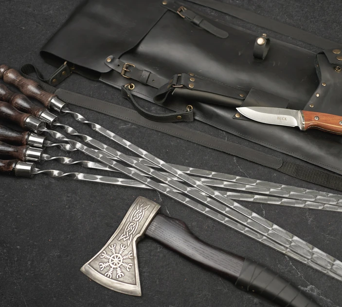 Набір шампурів «Ватажок» у шкіряному кейсі 8 предметів - це еталон розкоші та практичності для тих, хто цінує якість і стиль у всьому. Кожен шампур, створений з увагою до деталей, виготовлено з високоякісної неіржавкої сталі, що забезпечує їхню довговічність і стійкість до корозії. Завдяки зручним дерев'яним ручкам шампури надійно тримаються в руці, забезпечуючи комфорт під час приготування їжі на відкритому вогні.