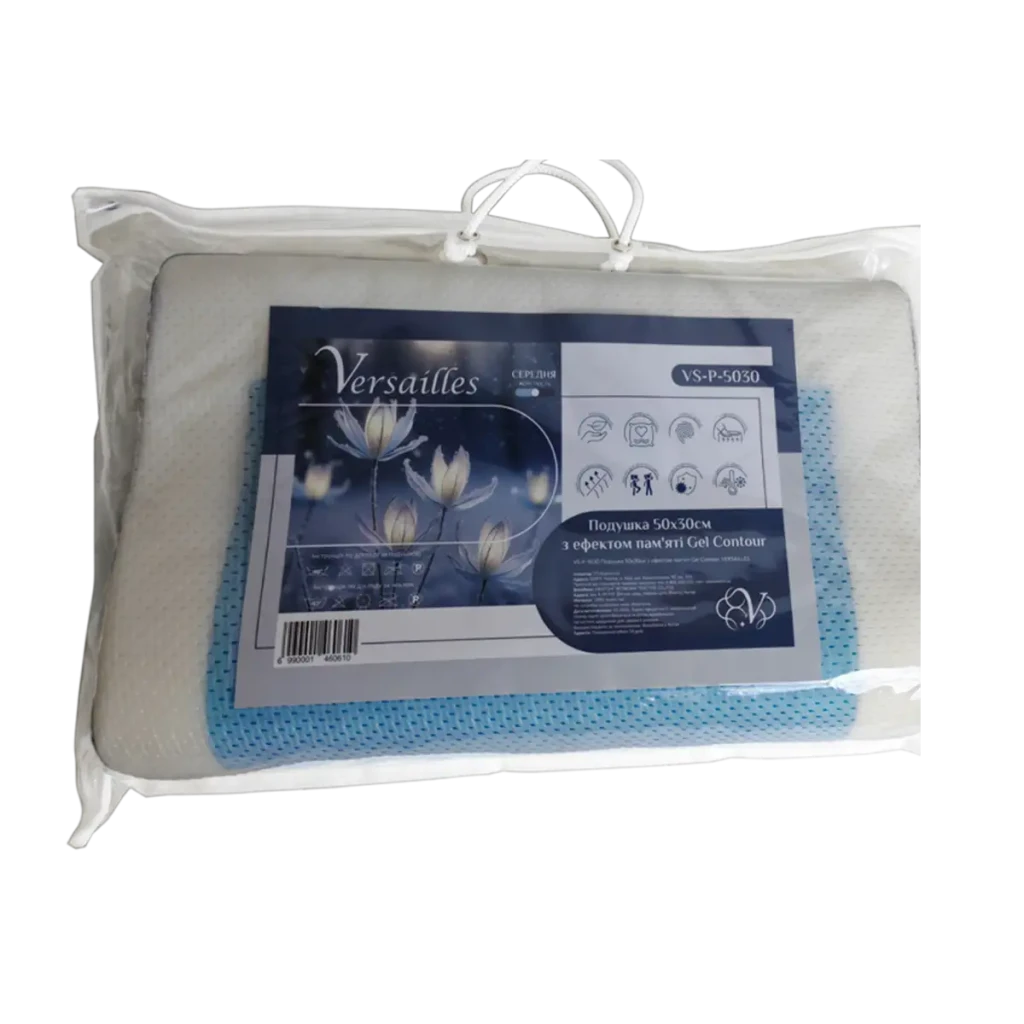 Подушка VERSAILLES Gel Contour 50×30 см — ергономічна подушка з ефектом пам’яті (memory foam) та гелевими вставками, що адаптується до форми голови та шиї для максимально комфортного сну. Контурна форма підтримує анатомічно правильне положення хребта, зменшує напругу в плечах і шиї, а гель забезпечує прохолоду та кращу циркуляцію повітря. Ідеально підходить для тих, хто цінує високу якість сну та здоровий сон.