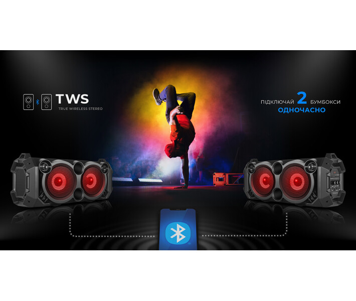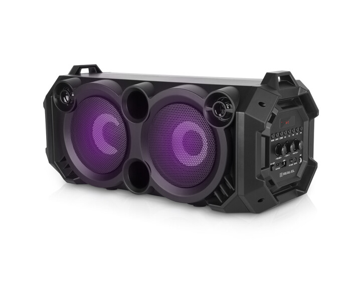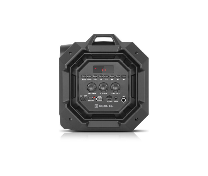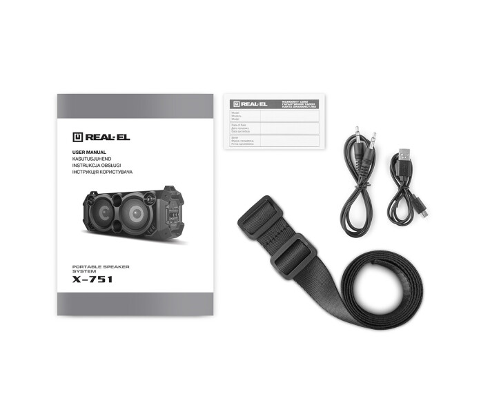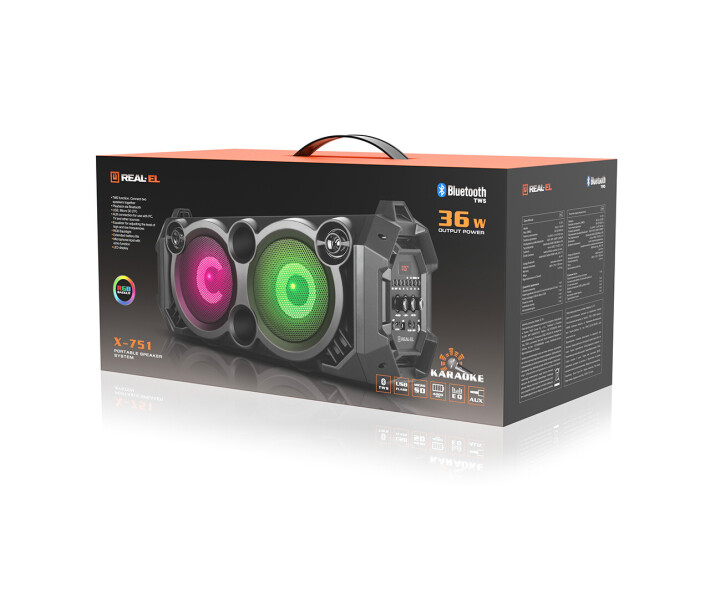 Мультимедійна портативна система REAL-EL X-751 має сучасний дизайн із якісним звучанням. Широкий функціонал бумбокса дозволяє прослуховувати музику як через виведення AUX, так і по Bluetooth. USB та Micro SD карти роз'єми дають можливість прослуховувати аудіо-файли з flash носіїв. X-751 чудовий супутник для відпочинку на природі, літій-іонний акумулятор на 4000 mAh забезпечить вас музикою на тривалий час. Мікрофонний вхід з функцією відлуння Передача аудіо сигналу по Bluetooth Радіус дії Bluetooth – до 10 метрів Еквалайзер TWS - одночасне підключення двох систем до одного джерела звукового сигналу