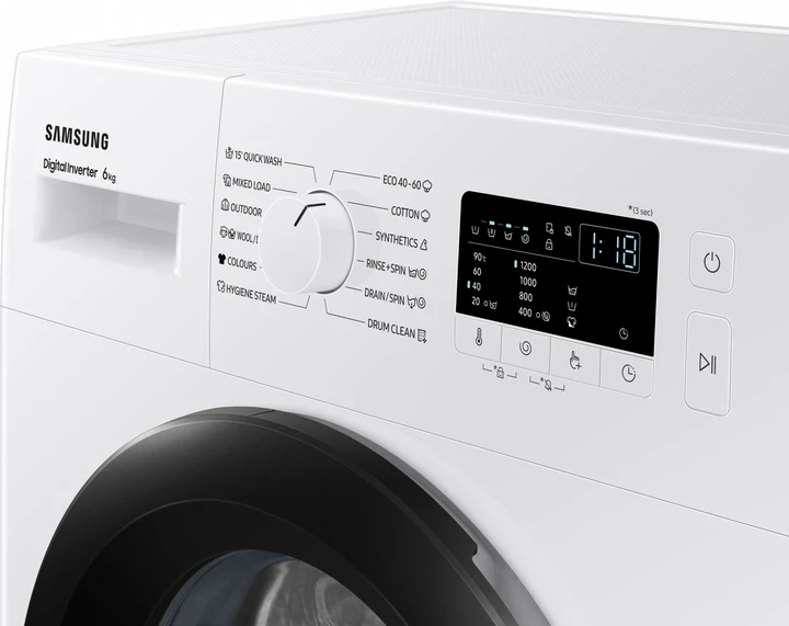 Пральна машина Samsung WW60A3120BE — сучасна фронтальна автоматична пральна машина для домашнього використання з максимальною завантаженням до 6 кг та максимальною швидкістю віджиму 1200 об/хв. Оснащена інверторним двигуном, який працює тихіше та ефективніше, а також LED‑дисплеєм і простим електронним керуванням. Підтримує низку програм прання (бавовна, синтетика, швидке прання, ECO, вовна тощо) та додаткові функції, як відстрочка старту, захист від дітей і функція очищення барабана для свіжості внутрішньої частини. Машина має енергоефективність класу C, споживає близько 43 л води за цикл, а її компактні габарити (≈595×850×400 мм) роблять її зручною для розміщення у більшості ванних чи пральних кімнат.