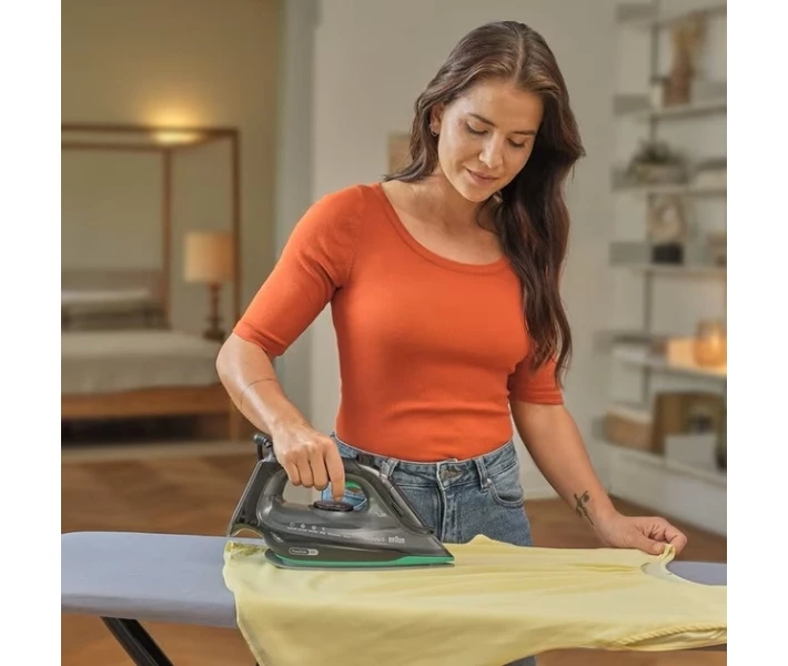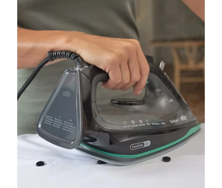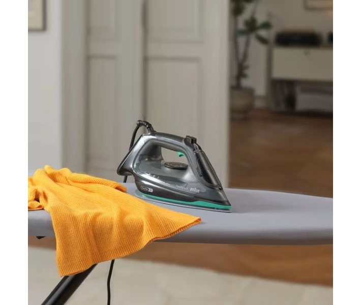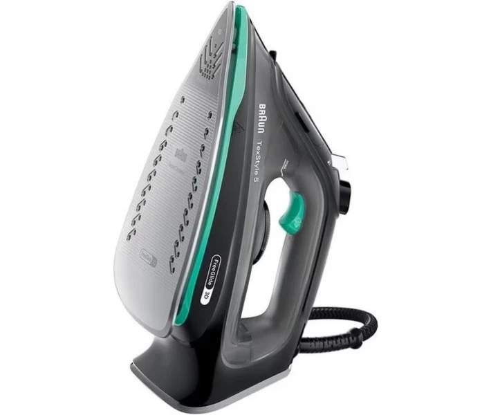 Праска Braun SI 5277 GR серії TexStyle 5. Потужність: 2700 Вт. Інноваційна, закруглена з заднього боку, підошва SuperCeramic 3D FreeGlide забезпечує плавне ковзання на 360 градусів, без зачіпання гудзиків, кишень і блискавок. Паровий удар: 220 г/хв. Регульована подача пари: 0-50 г/хв. Обсяг резервуара для води: 300 мл. Вертикальне відпарювання. Система антинакип і антикапля. Швидке нагрівання (Праска готова до прасування найжорсткіших тканин при максимальній температурі всього за 30 секунд). Функція дезінфекції (За лічені секунди знищує понад 99,99% бактерій і вірусів) *. Паровий носик. Колір: чорний/зелений.