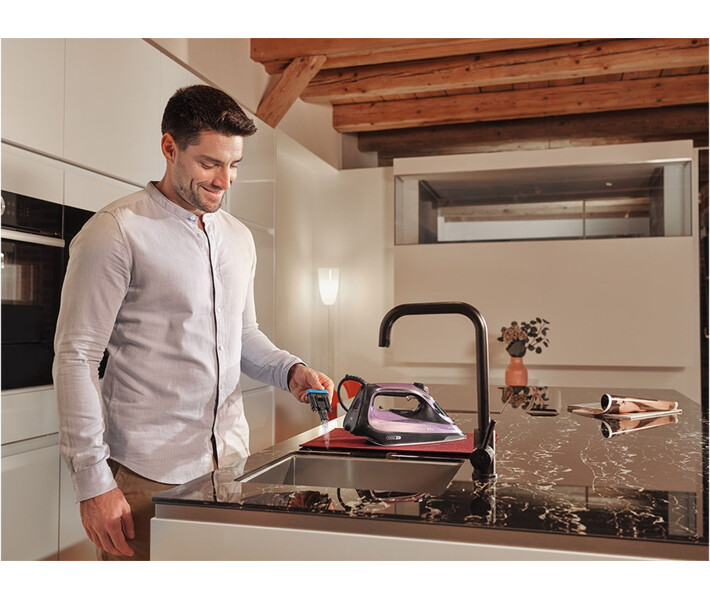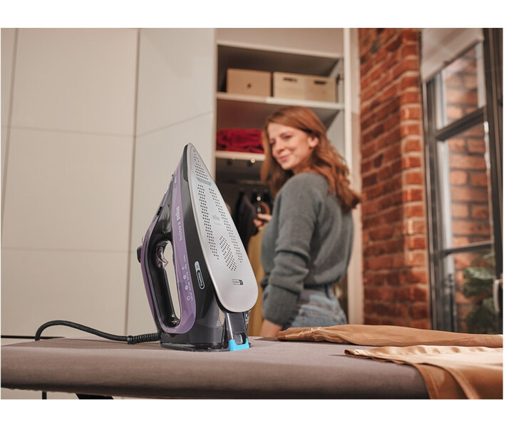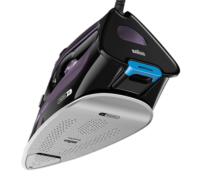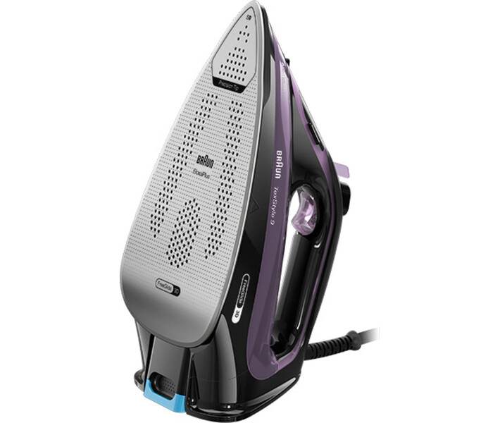 Праска Braun SI 9661 VI серії TexStyle 9. Потужність: 3100 Вт. Інноваційна, закруглена з заднього боку, підошва Eloxal Plus 3D FreeGlide забезпечує плавне ковзання на 360 градусів, без зачіпання гудзиків, кишень і блискавок. Унікальна технологія iCare (дозволяє гладити як делікатні тканини, так і грубі матерії без додаткових налаштувань). Паровий удар: 230 г/хв. Регульована подача пари: 0-50 г/хв. Обсяг резервуара для води: 330 мл. Вертикальне відпарювання. Система ActiClean і антикапля. ЕКО-режим. Функція автоматичного відключення. Паровий носик. Підходить для водопровідної води. Нагадування про видалення накипу. Колір: фіолетовий.