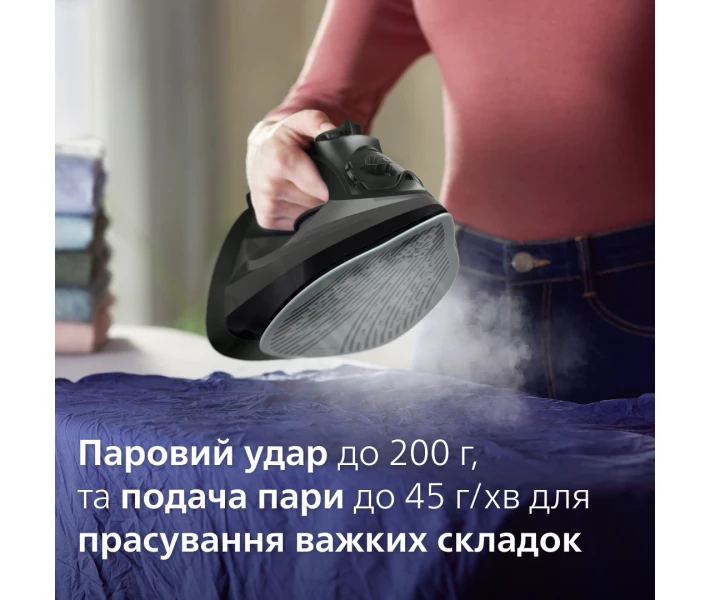 Система подачі пари генерує до 45 г/хв пари, яка полегшує прасування і допомагає домогтися більш якісних результатів. Регулюйте кількість пари залежно від типу тканини. Якщо потрібно випрасувати лляну або бавовняну річ зі складними складками, активуйте функцію парового удару. Різке збільшення кількості до 230 г і подача під високим тиском дозволяє парі проникнути в усі шари тканини, розпрямляючи прим'яті волокна зсередини.
