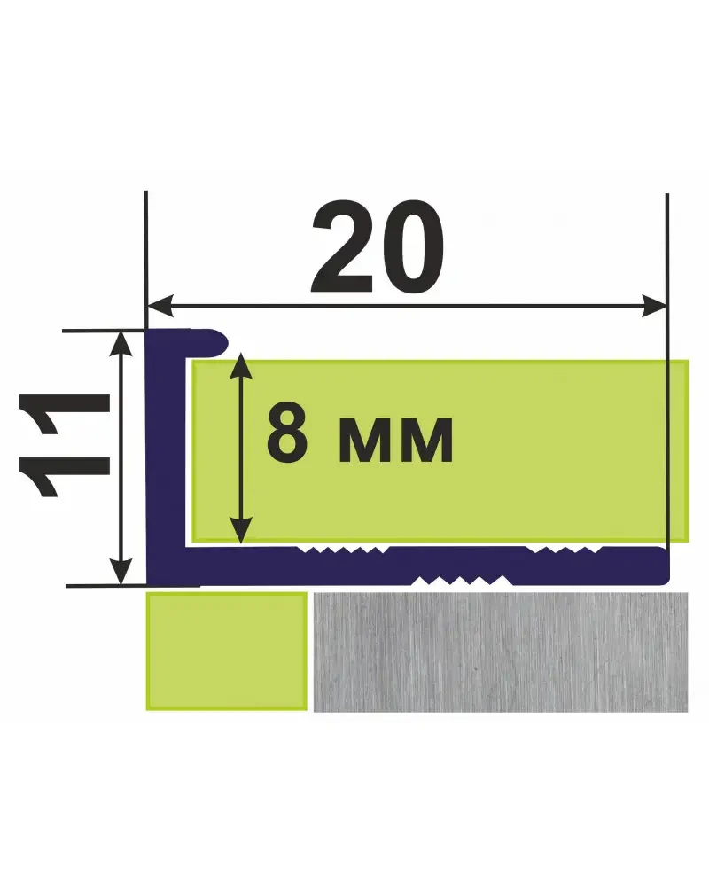 Облицювальний алюмінієвий куточок L - подібної форми. Гнучкий Зовнішній куточок АПГ 12 - підходить для плитки, товщиною до 8 мм. Прямокутна форма Г-профілю додасть будь-якому куту чітку і правильну форму, а також захистить тендітні краї керамічної плитки від відколів і приховає нерівності плитки. Завдяки спеціальній перфорації, у вигляді щітки, профіль можна використовувати як арковий, створювати красиве торцеве оформлення криволінійних і напівкруглих дизайнерських конструкцій. Цей плитковий торцевий алюмінієвий профіль використовують не тільки для керамічної плитки, а і як декоративний елемент для оздоблення стін, стель, меблів тощо.