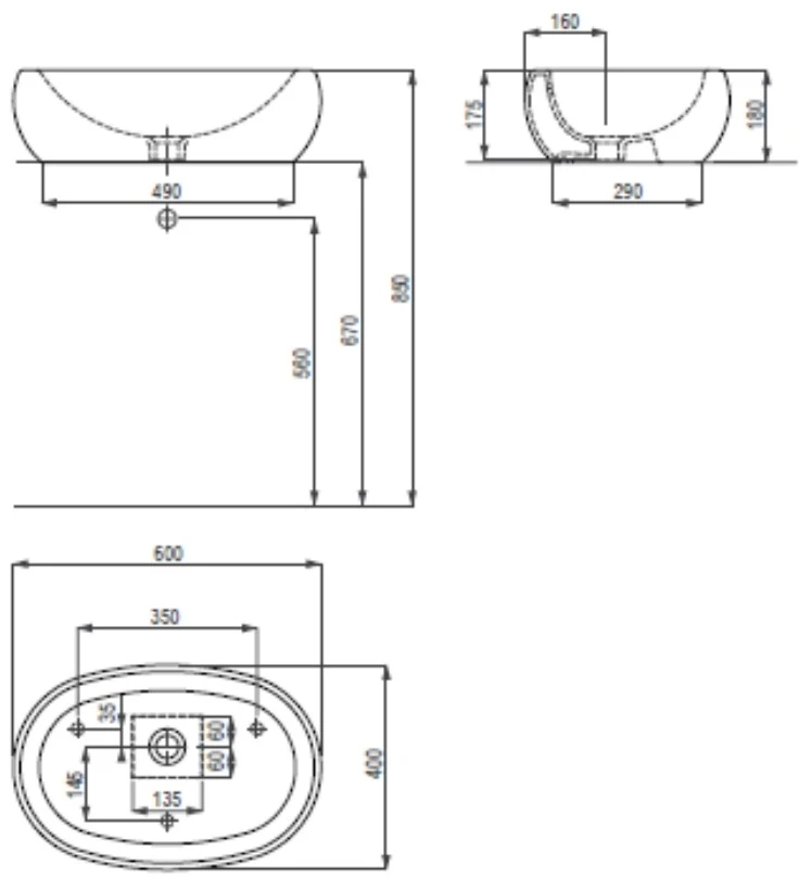 Тип монтажу: накладний на стільницю; матеріал: кераміка; форма: овальна; перелив; комплектація: чаша (умивальник); колір білий; габарити (мм): 600х400х180.