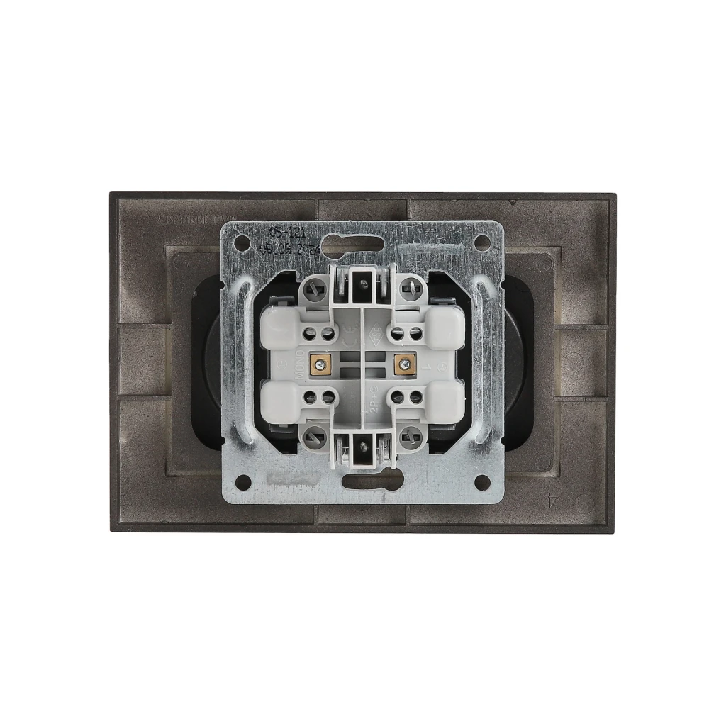 Двогніздна розетка без заземлення Mono Electric (серія DESPINA, колір «графіт») — настінна розетка з двома гніздами, без контакту заземлення. Має стильний темний колір, добре підходить до сучасних інтер’єрів, де не потрібне заземлення, та зручна для підключення побутової техніки з подвійною ізоляцією.