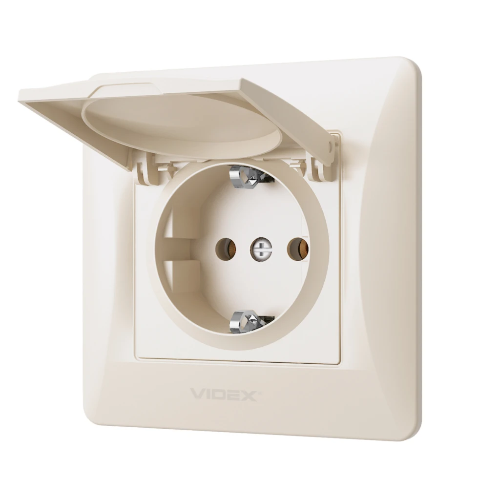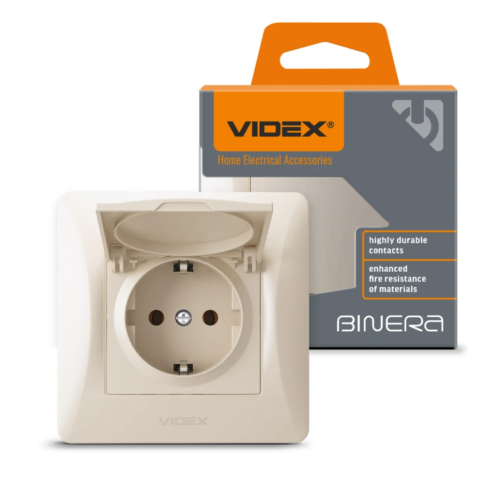 Розетка VIDEX BINERA 1-на з заземленням та кришкою кремова (VF-BNSK1GC-CR)