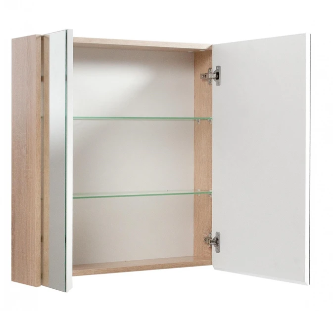 Корпус та фасад шафи Смарт виготовлені з вологостійкого ДСП, що гарантує довговічність за умов підвищеної вологості. Дві дзеркальні дверцята оснащені доводчиками для плавного закривання. Усередині шафи Смарт розміщено дві скляні полиці, що забезпечують зручне зберігання. Надійне настінне кріплення забезпечує стійкість конструкції.