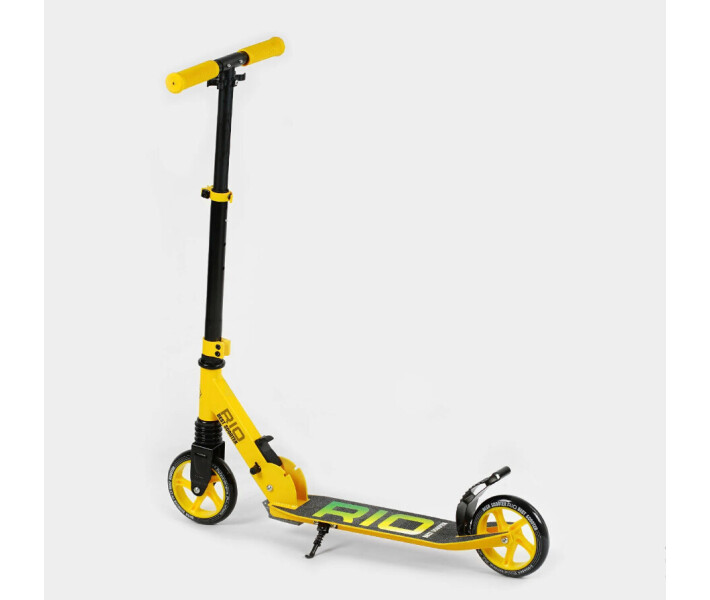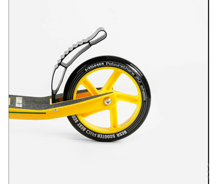 Самокат має передній амортизатор, алюмінієву міцну основу (дека), сталеве кермо. Гальмо самоката здійснюється ножним гальмом при натисканні на алюмінієве крило заднього колеса. Кермо регулюється в 3-х положеннях, завдяки цьому Ви легко підберете комфортну висоту для себе або дитини. М'які гумові грипси забезпечать неймовірно комфортне та впевнене керування, оскільки руки дитини не зісковзнуть з основи. Самокат має зручну систему складання, його зручно зберігати та транспортувати. Поліуретанові колеса; колесо 145 мм; заднє 145 мм; - Висота керма регулюється в 3-х положеннях; - мінімальна висота керма від підлоги – 68 см; - максимальна висота керма від підлоги – 89 см; - Висота листа від підлоги - 8 см; довжина деки – 54.5 см, корисна довжина деки – 34.5 см. Вік – від 5-ти років Максимальне навантаження – 60 кг.