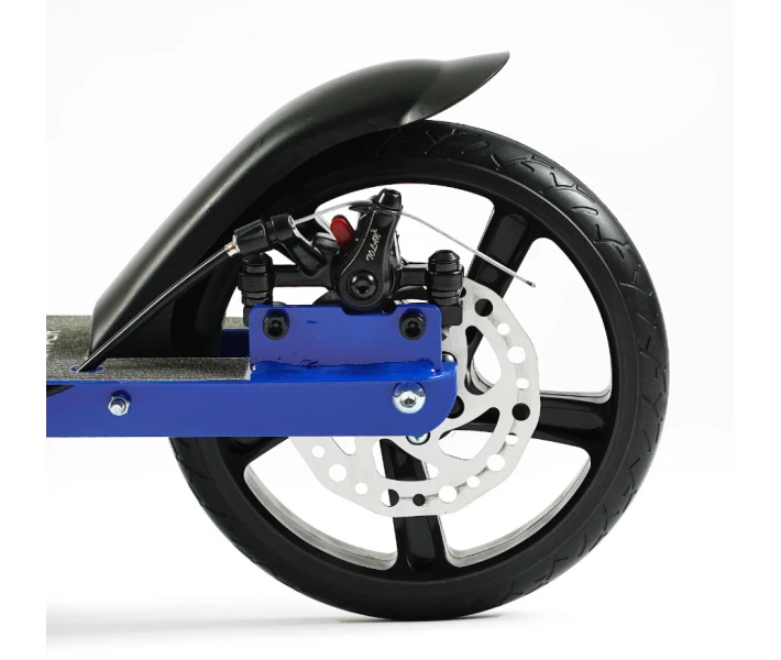 Висоту керма можна відрегулювати відповідно до зростання користувача. Поліуретанові колеса оснащені високоякісними стійкими до зносу підшипниками. Для уповільнення ходу або екстреної зупинки передбачено ножне гальмо, розташоване над заднім колесом, а також ручне дискове гальмо заднього колеса. Механізм складання дозволяє надати самокату компактного вигляду, що значно спрощує його транспортування.