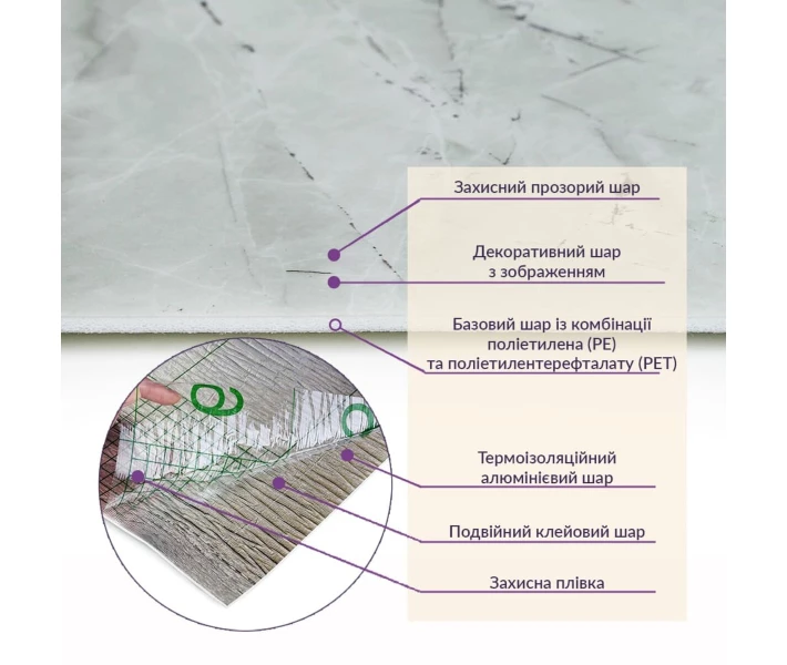 Шари матеріалу: Захисний прозорий шарДекоративний шар із зображеннямБазовий шар з комбинації поліетилена (PE) і поліетилентерефталату (PET)Термоізоляционийй алюмінієвий шарПодвійний клейовий шарЗахисний папір