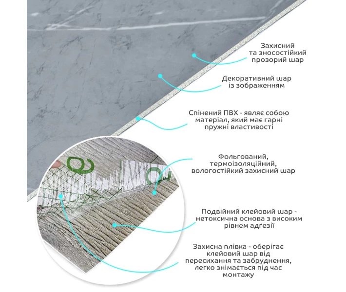 Захисна плівка – оберігає клейовий шар від пересихання та забруднення, легко знімається під час монтажу.