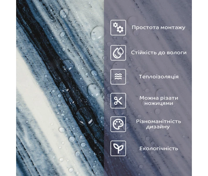 2.Стійкість до вологи: матеріал стійкий до впливу вологи та пари, а також до появи цвілі, що робить його придатним для використання в приміщеннях з високою вологістю, таких як ванні кімнати та кухні. Плитка підійде для створення фартуха кухні, можна клеїти біля плити на відстані не менше 20-25 см;