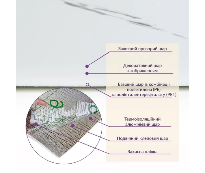 Шари матеріалу: Захисний прозорий шарДекоративний шар із зображеннямБазовий шар з комбинації поліетилена (PE) і поліетилентерефталату (PET)Термоізоляционийй алюмінієвий шарПодвійний клейовий шарЗахисний папір