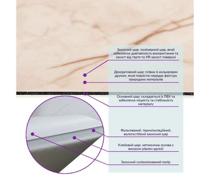 - Полімерний шар: захищає від потертостей та дрібних механічних пошкоджень, забезпечує довговічність використання, а УФ захист допомагає запобігти вигоранню, зберігаючи колір насиченим.