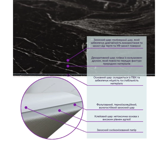 - Декоративний шар: плівка з кольоровим друком високої якості, яка повністю імітує фактуру природних матеріалів завдяки чіткому та деталізованому зображенню.