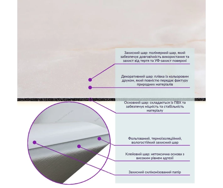 - Полімерний шар: захищає від потертостей та дрібних механічних пошкоджень, забезпечує довговічність використання, а УФ захист допомагає запобігти вигоранню, зберігаючи колір насиченим.