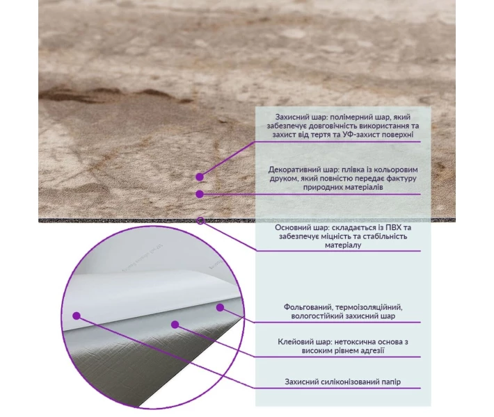 - Полімерний шар: захищає від потертостей та дрібних механічних пошкоджень, забезпечує довговічність використання, а УФ захист допомагає запобігти вигоранню, зберігаючи колір насиченим.