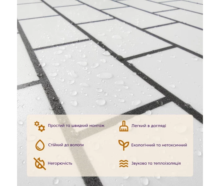 Легка установка: самоклеючий шар робить процес укладання швидким і простим, не вимагаючи додаткового клею, додаткових матеріалів чи спеціалістів. Матеріал укладається стик в стик, його можна різати ножицями чи монтажним ножем, між смугами не розходиться, не набухає і не деформується. Відсоток обрізу становить 1%, що є найкращим показником для настінних покриттів; Стійкість до вологи: вінілова плитка стійка до вологи, що робить її відмінним вибором для ванних кімнат, кухонь та інших приміщень з підвищеною вологістю, матеріал стійкий також до впливу пари, а також до появи плісняви. Плитка підходить для створення фартуха кухні, можна клеїти біля плити на відстані не менше ніж 30-50 см; Довговічність: міцність та зносостійкість вінілу дозволяє плитці залишатися в первинному стані протягом тривалого періоду часу; Естетична складова: широкий вибір дизайнів та кольорів (імітація натуральних матеріалів та абстракції) дає можливість підібрати покриття, яке відповідає вашому стилю та інтер'єру, дуже добре комбінується за гамою кольорів, дозволяючи створити власний дизайн приміщення; Легкий догляд: вініл легко очищається і не вимагає спеціальних засобів для чищення. Ізоляція: плитка має тепло та звукоізоляційні властивості; Екологічна безпека: вінілову плитку виготовляють з відновлювальних ресурсів, а сам матеріал безпечний для здоров'я та навколишнього середовища.