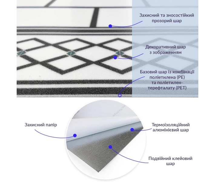 Полімерний шар, що захищає від потертостей та дрібних механічних пошкоджень, забезпечує довговічність використання, а УФ захист допомагає запобігти вигоранню, зберігаючи колір насиченим, внаслідок чого плитка довго має свій первісний естетичний вигляд. Декоративний шар: плівка з кольоровим друком високої якості, яка повністю імітує фактуру природних матеріалів завдяки чіткому та деталізованому зображенню. Основний шар з спіненого поліетилентерефталату (PET) - це полімер, що складається з довгих ланцюгів молекул вінілхлориду, в яких містяться атоми хлору, це надає матеріалу стійкість до впливу хімічних речовин. ПВХ є аморфним полімером, така особливість будови робить його пружним та ударостійким, а завдяки стабілізаторам та пом'якшувачам, матеріал має малу вагу. Фольгований шар: основна властивість цього шару – відображення теплових хвиль, що дозволяє мінімізувати теплові втрати, тим самим покращити теплоізоляцію приміщення. Клейовий шар: нетоксична основа з високим рівнем адгезії. Захисний силіконізований папір – оберігає клейовий шар від пересихання та забруднення, легко знімається під час монтажу.