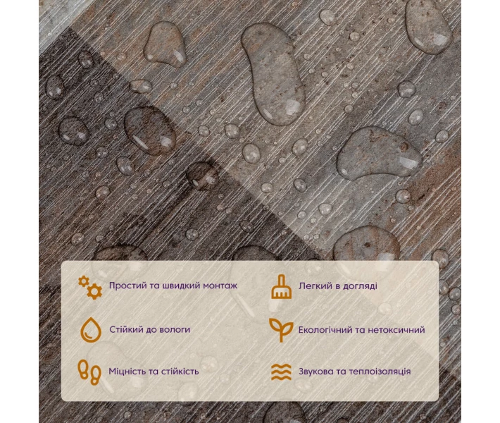 Легка установка: низька вага матеріалу спрощує процес транспортування та монтажу, а клейовий шар робить процес укладання швидким, не вимагаючи додаткових матеріалів чи спеціалістів. Матеріал укладається стик в стик, його можна різати ножицями чи монтажним ножем, між смугами не розходиться, не набухає і не деформується. Відсоток обрізу становить 1%, що є найкращим показником для настінних покриттів. Стійкість до вологи: вінілова плитка під ламінат стійка до вологи, що робить її відмінним вибором для кухні та інших приміщень з підвищеною вологістю, матеріал стійкий також до впливу пари та до появи плісняви. Міцність та стійкість: полімерний шар захищає від потертостей та механічних пошкоджень, забезпечуючи довговічність використання. Додатковий захист від УФ-променів допомагає уникнути вигоряння та зберігає колір насиченим. Естетика: широкий вибір дизайнів, що імітують натуральні матеріали, дає можливість підібрати покриття, яке відповідає вашому стилю та інтер'єру, дуже добре комбінується за гамою кольорів, дозволяючи створити власний дизайн приміщення. Легкий догляд: вініл легко очищається і не вимагає спеціальних засобів. У разі пошкодження окремої плитки ви можете легко замінити її без необхідності великого ремонту. Звукоізоляція: конструкція шарів забезпечує додаткову звукоізоляцію та робить помешкання більш комфортними. Екологічна безпека: вінілова плитка під ламінат не містить токсичних речовин і виготовляється з відновлювальних ресурсів, що робить її безпечною для здоров'я та довкілля.
