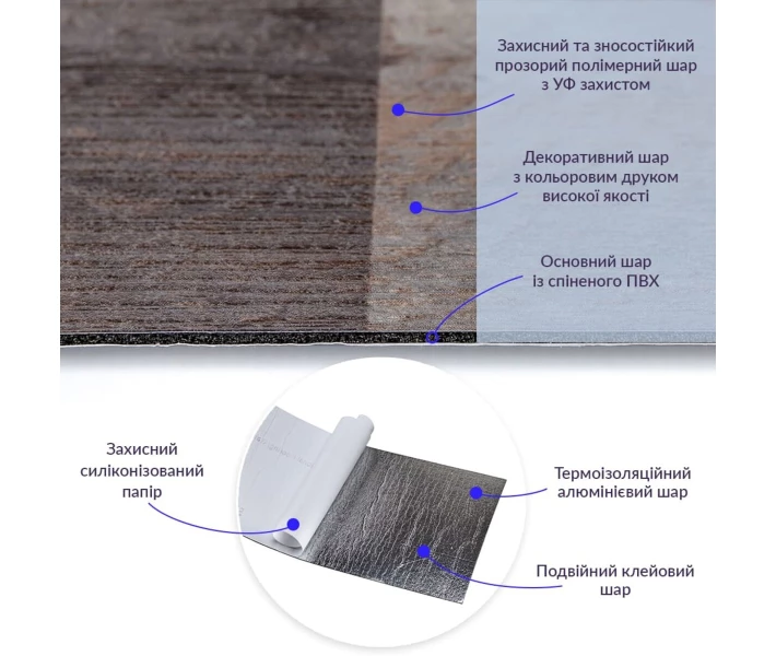 Полімерний шар (прозорий), що захищає від потертостей та дрібних механічних пошкоджень, забезпечує довговічність використання, а УФ захист допомагає запобігти вигоранню, зберігаючи колір насиченим, внаслідок чого вініловий ламінат довго має свій первісний естетичний вигляд. Декоративний шар: плівка з кольоровим друком високої якості, яка повністю імітує фактуру природних матеріалів завдяки чіткому та деталізованому зображенню. Основний шар зі спіненого полівінілхлориду (ПВХ) - це полімер, що складається з довгих ланцюгів молекул вінілхлориду, в яких містяться атоми хлору, це надає матеріалу стійкість до впливу хімічних речовин. ПВХ є аморфним полімером, така особливість будови робить його пружним та ударостійким, а завдяки стабілізаторам та пом'якшувачам, матеріал має амортизаційні властивості та малу вагу. Фольгований шар: основна властивість цього шару – відображення теплових хвиль, що дозволяє мінімізувати теплові втрати, тим самим покращити теплоізоляцію приміщення. Клейовий шар: нетоксична основа з високим рівнем адгезії. Захисний силіконізований папір – оберігає клейовий шар від пересихання та забруднення, легко знімається під час монтажу.
