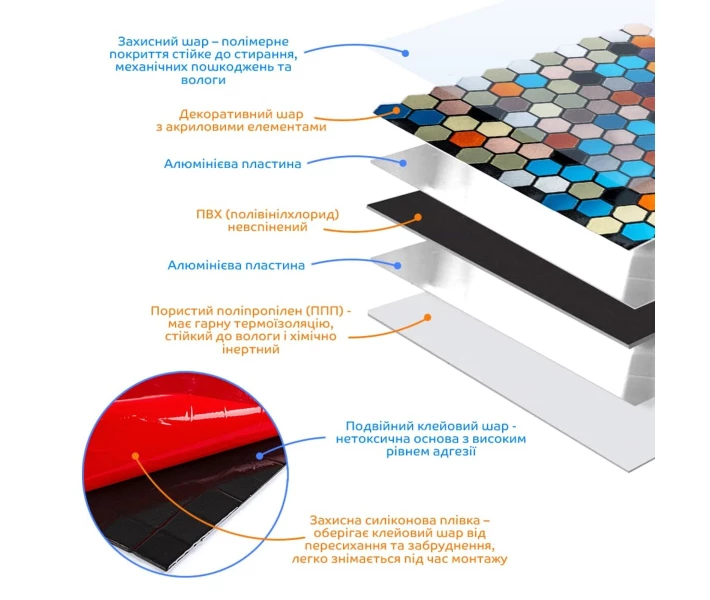 - Захисний силіконізований папір: захищає клейовий шар від пересихання та забруднення, легко знімається під час монтажу.