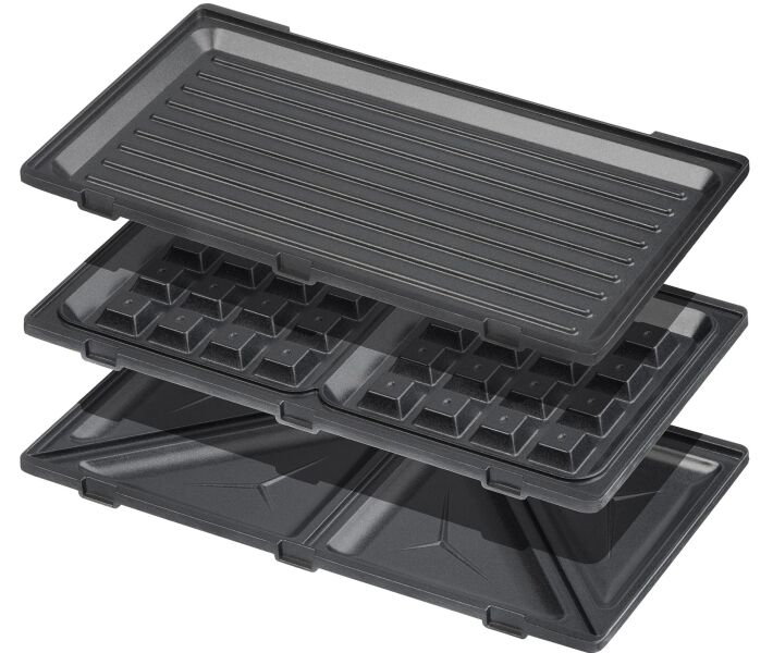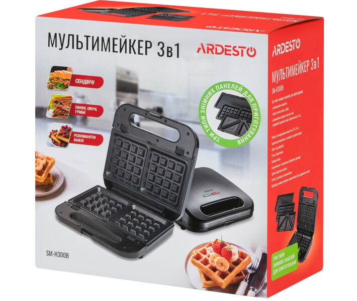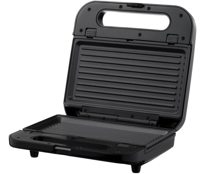 Мультимейкер чорного кольору потужністю 700 Вт і трьома знімними пластинами для приготування сендвічів, паніні, овочів гриль, грибів, а також різних вафель.