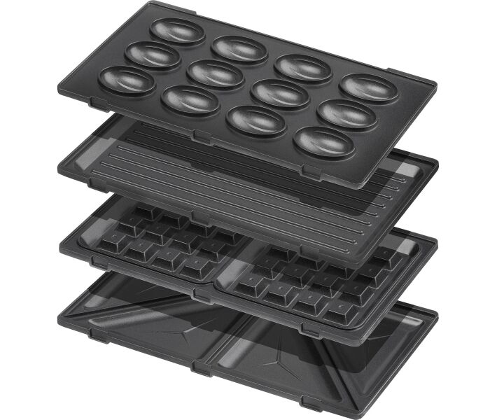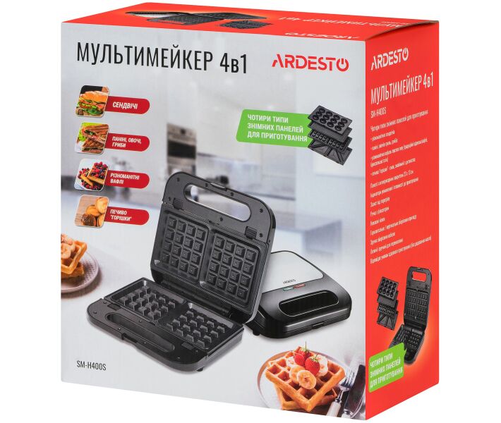 Мультимейкер чорно-сірого кольору потужністю 700 Вт і чотирма знімними пластинами для приготування сендвічів, Паніні, овочів гриль, грибів, різних вафель, а також печива «Горішок».