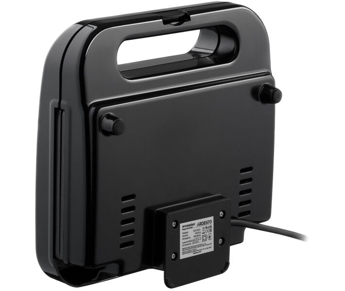 Антипригарне покриття забезпечує легке очищення пластин і можливість приготування без додавання масла, а для зручного транспортування передбачено ручку з фіксатором. Індикатори на верхній панелі відображають готовність пристрою до приготування.