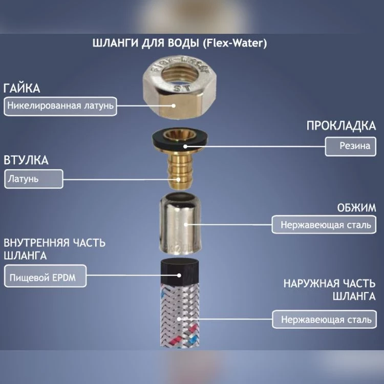 • Зовнішня частина шланга покрита металевим обплетенням з нержавіючої сталі, яка стійка до вологості, зміни тиску води (гідроударів), перекручуванням та зламам.