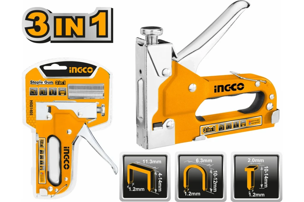 Механічний степлер INGCO 3 в 1 HSG1405 застосовується для кріплення ізоляційного матеріалу, панелей і облицювання до різних поверхонь (дерево, ДВП, ДСП, гіпсокартон, пластик).