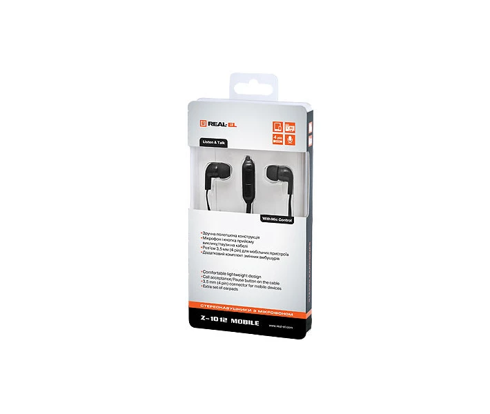 Навушники з мікрофоном REAL-EL Z-1012 Mobile призначені для роботи із сумісними з ними системами (портат. програвачами, комп. ігровими приставками тощо). Їх також можна використовувати в інтернет-телефонії, при проведенні відеоконференцій, для розпізнавання мовлення та навчання іноземним мовам. кнопка прийому виклику/паузи на кабелі
