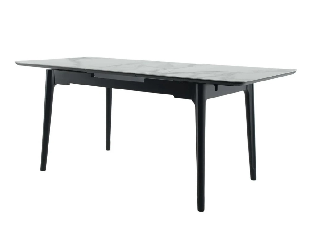 Обідній стіл зі стільницею у світлому відтінку «каса вайт» і контрастною чорною основою. Стильний вибір для сучасного інтер'єру.