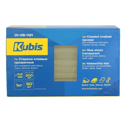 Стрижні Kubis 01-06-1121 використовуються з клейовими пістолетами. Призначені для створення з'єднань високої міцності, що витримують великі навантаження. Прозорі стрижні є універсальними і можуть застосовуватися для склеювання виробів з картону, полімерних матеріалів, пластиков, гуми, лінолеуму, шкіри, тканини, кераміки, фарфору, скла.