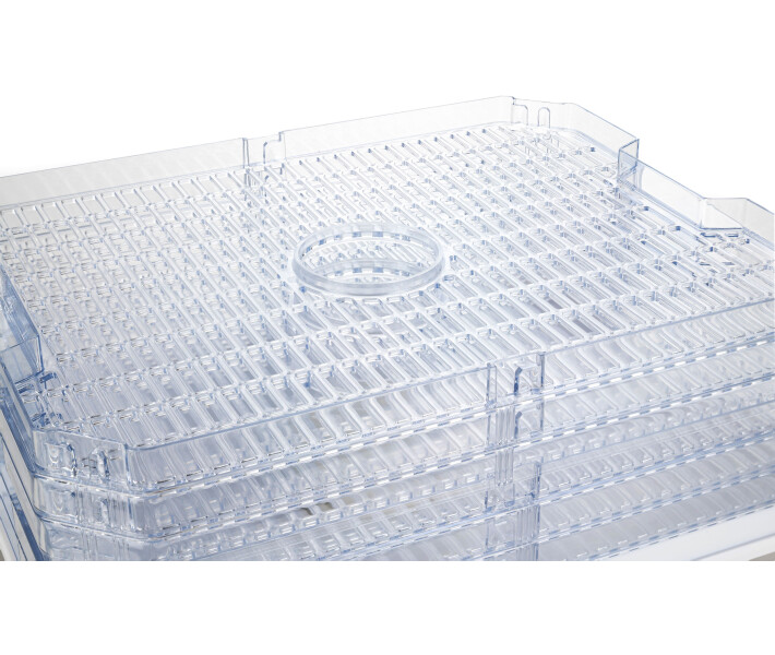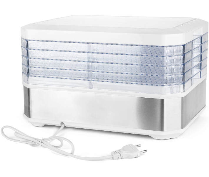 Сушарка має 5 сушильних піддонів діаметром 38 см і висотою 2 см, що дозволяє сушити велику кількість продуктів за один раз. Прямокутна форма виробу дозволяє розміщувати продукти ефективно, забезпечуючи оптимальне використання простору. Всі лотки, включаючи сам пристрій, виготовлені з екологічного харчового пластику, що в процесі роботи не виділяє шкідливих речовин. Крім того, пластик має підвищену стійкість до ударів і подряпин. Ця сушарка для продуктів EISEN EFD-055W - це ідеальний вибір для тих, хто хоче зберігати продукти довше, зберігаючи їх всі корисні властивості.