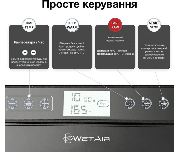 Температурні режими дадуть змогу вибрати оптимальний режим для різних типів продуктів для того, щоб домогтися бажаного ступеня їхньої дегідрації і, водночас, максимально зберегти харчові та корисні властивості. Два попередньо встановлені режими FAST (70 °C, 10 годин) і RAW (45 °C, 24 години) пришвидшать процес налаштування й запуску роботи сушарки. А наявність функції KEEP WARW дає можливість встановити автоматичне підігрівання, за якого сушарка після основного циклу сушіння автоматично переходить у режим роботи за температури 35 °C до 24 годин.
