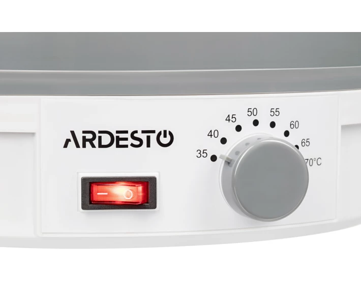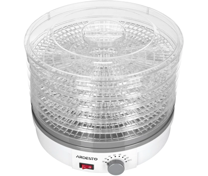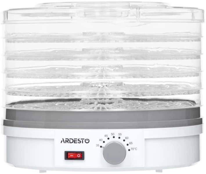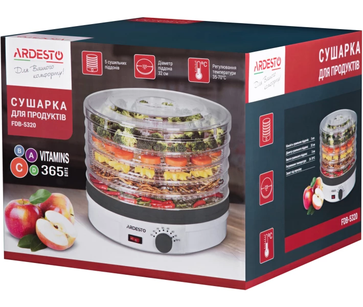 Сушка для фруктів та овочів FDB-5320 виконана у вигляді циліндричної форми, всередині якого розташовані, п'ять піддонів для розміщення нарізаних продуктів. Температура регулюється надійною і перевіреною роками механікою. Апарат підключається до електромережі і виставляється температура необхідна для продуктів, які завантажені в сушилку ARDESTO. Фрукти, ягоди, гриби, кабачки, баклажани, солодкий перець, помідори перед завантаженням в FDB-5320 безпосередньо перед сушінням необхідно вимити і порізати.