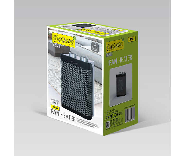 Тепловентилятор з керамічним ТЕН Maestro MR 924 працює в двох режимах потужності нагрівання 1000 і 1500 Вт, а також просто в режимі вентилятора. Випускається у сталевому корпусі із чорною вставкою. Тепловентилятор призначений для обігріву закритих приміщень площею до 20 кв. Maestro MR 924 Оснащений системами захисту (автоматичне відключення) від перегріву та при перекиданні
