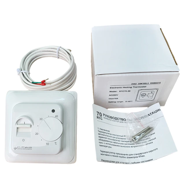 Терморегулятор In-Therm RTC 70 - механічний термостат для теплих підлог з виносним датчиком підлоги (3м). Терморегулятор максимально простий у використанні. Тумблер ввімкнення/вимкнення. Регулятор температури у вигляді коліщатка. Світлодіод, який світиться, якщо система теплої підлоги включена. Монтаж в стандартну монтажну коробку. Кнопка вимкнення живлення 16 А, IP 20. Терморегулятор сам відключає теплу підлогу при досягненні необхідної температури. Як тільки температура опускається на пару градусів, термостат вмикає ТП, доводить до потрібної і потім знову вимикає. За рахунок цього, тепла підлога працює не весь час, а в 2-3 рази менше.