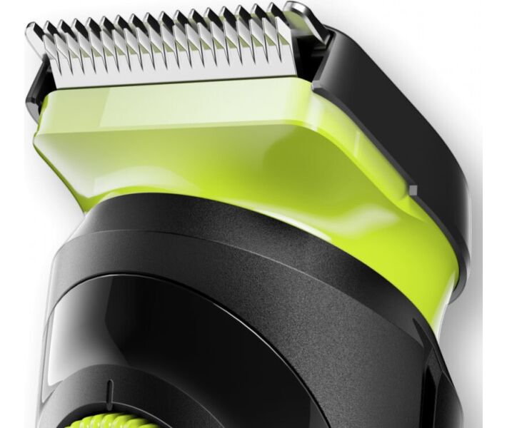 Корпус пристрою виконаний з якісних матеріалів в чорному і салатовий колір. Використовуваний пластик гіпоалергенний і стійкий до пошкоджень, а ножі виготовлені з міцного металу і є досить гострими для швидкого і при цьому безпечного гоління. Додатково леза самозаточуються і мають необмежений термін служби. На корпусі розташовані елементи управління - колесо налаштувань і кнопка для початку або завершення роботи пристрою. У комплекті є щіточка для чистки насадки, блок для зарядки триммера.