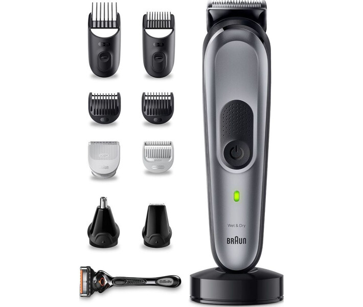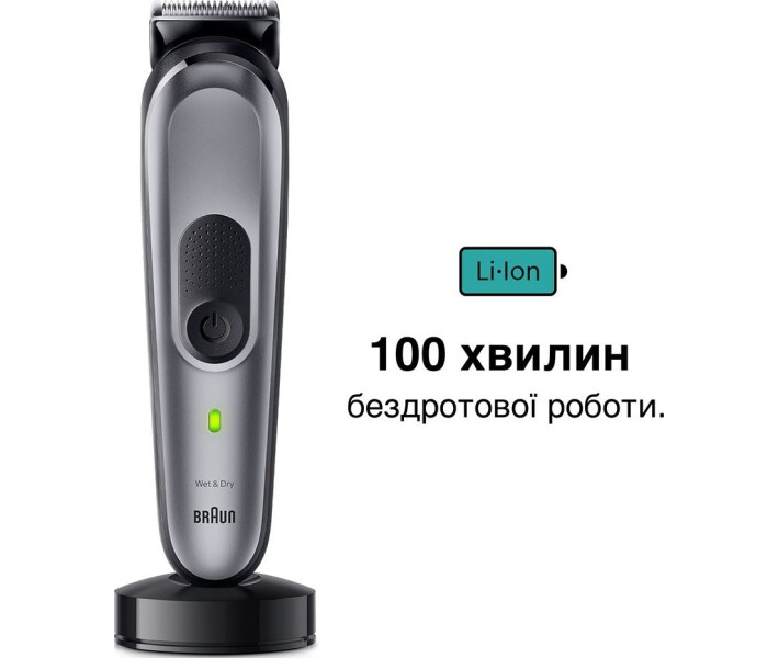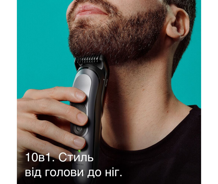 Набір Braun Style Kit 10-в-1 для догляду за волоссям з голови до ніг: спеціально підібрані інструменти для стрижки бороди, вух та носа, стрижки волосся та догляду за всім тілом - Ваш стиль без зусиль: надгостре лезо ефективно для швидкого догляду за будь-якою поверхнею - Легко укладати волосся будь-якої довжини: відмінні результати на волоссі будь-якої довжини за допомогою фіксуючих гребенів 1 і 2 мм та ковзних гребенів для бороди (3–21 мм) - Створений на віки: цей набір для догляду за волоссям для чоловіків оснащений потужним літій-іонним акумулятором зі 100-хвилинним часом автономної роботи, ультрагострими лезами та 100% водонепроникністю - Створений для кожного кроку вашої домашньої рутини: цей набір для догляду за собою для чоловіків включає сумку для зберігання у ванній