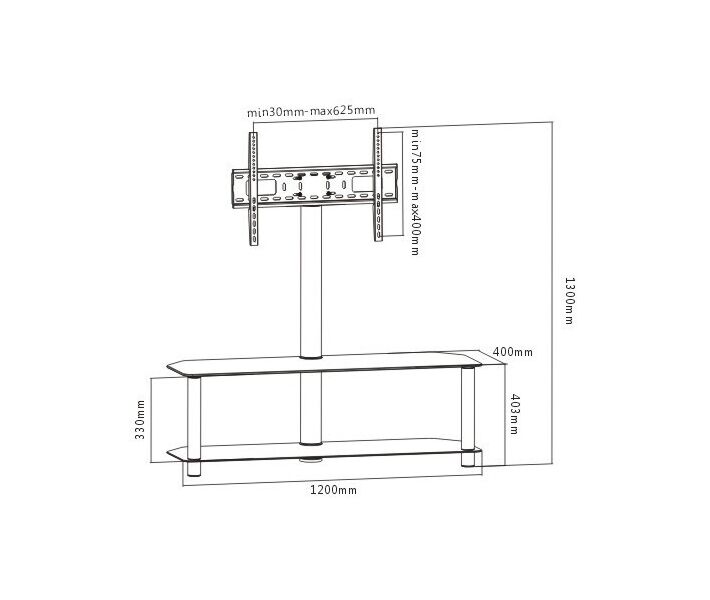 Габарити (ШхВхГ): 1200х1300х400 мм, Товщина скла: 8/5 мм, Максимально допустима навантаження вагою до 40 кг, VESA: макс 600х400 мм, Для телевізорів діагоналлю від 32 "до 55", Чорні ноги, чорне скло