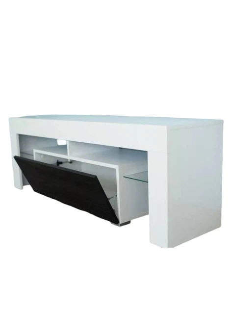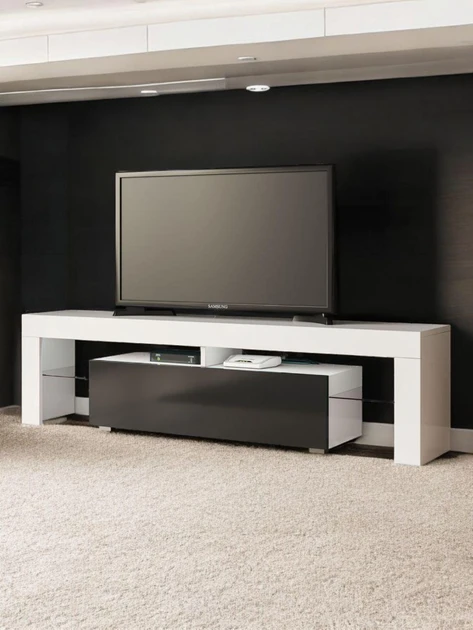 ТВ тумба Моніка - чудовий предмет для облаштування сучасної вітальні. Тумба складається з одного закритого відділення з відкидними дверцятами, для зберігання речей і двох скляних полиць. На широкій основі оригінальної та стильної тумби поміститься телевізор будь-якої діагоналі. Корпус та фасади виконані з ламінованого ДСП високої якості у контрастному поєднанні кольорів "німфея альба глянець / чорний глянець". Характерними особливостями ТБ тумби є елегантність, сучасний дизайн, мінімальне декоративне оформлення, цікаве дизайнерське рішення: відсутність традиційних ручок, їх роль виконує торець фасаду, надійна та практична фурнітура, що забезпечує максимально комфортне використання. ТБ тумба гармонійно поєднує в собі вишуканість стилю та неймовірну практичність та комфорт.