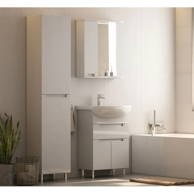 Колекція SIMPLI виконана в мінімалістичному стилі і сподобається всім, хто любить простоту в дизайні і функціональність. Особливість ручок, у вигляді внутрішньої фрезерування фасаду, дозволяє використовувати комплект меблів в різних інтер'єрах. Для зручності використання направляючі повного висунення додатково посилені, а для безшумного і плавного закриття дверей використовують петлі з амортизатором. Комплектуються моделі металевими регульованими ніжками з хромованим покриттям. Корпус меблів виготовляється з ламінованого ДСП-з підвищеною вологостійкістю. Фасади меблів виконані з ЛМДФ. Фасадна і бічні частини меблів покриваються білою глянсовою емаллю. За орними дверцями тумби розташоване містке відділення для зберігання необхідних речей. Колекція SIMPLI виглядає гармонійно і просто, створюючи неповторний сучасний стиль інтер'єру ванної кімнати.